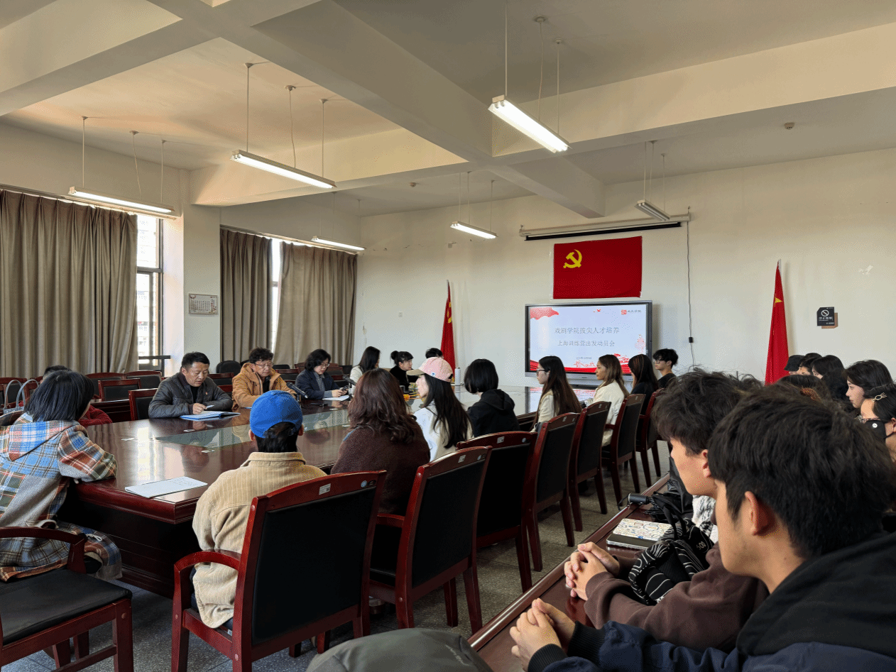 杨军院长发言,对学生们寄予厚望,希望他们学有所获、满载归来,并代表学院为本次拔尖人才班上海训练营授予班旗。此次训练营由戏文系王泽君副教授、姚又僮老师、赵凌立老师三位全程带队前往上海。其间,戏剧学院党政班子会前去出席相关活动环节。
