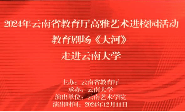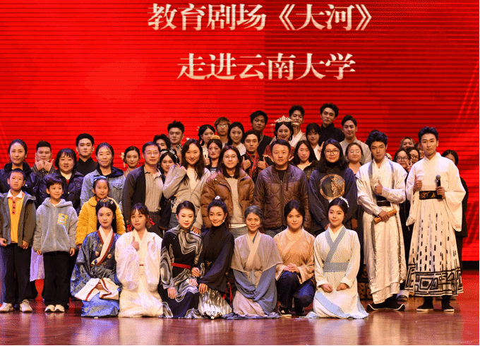 为深入学习贯彻党的二十大和二十届三中全会精神,进一步推进中国特色社会主义文化繁荣,弘扬中华优秀传统文化与校园美育精神。12月11日晚,bw必威西汉姆联官方网站戏剧学院原创教育剧场《大河》在云南大学呈贡校区云大会堂礼堂精彩上演,此次演出,不仅为观众带来一场艺术上的视听盛宴,也在思想和情感上和云大师生们产生激烈的碰撞和深度的交流。