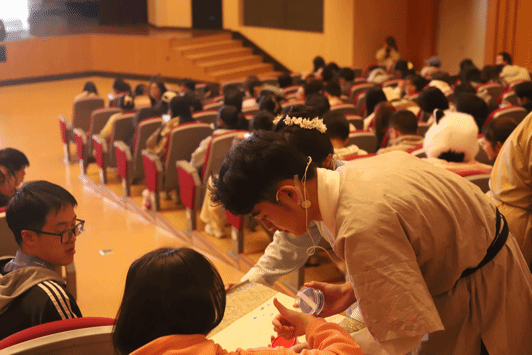 教育剧场的一个重要特点是其互动性。《大河》在演出过程中,通过观众投票、互动问答等方式,增强了观众的参与感和代入感。在互动环节中,云大师生以“民众代表”身份积极参与到剧中的重大决策,并展开了激烈的辩论。其中一位同学不仅提出“男儿本该保家卫国”,还引出了“花木兰”等女性英雄形象;甚至还有同学从数学概率出发,反问对方代表“难道你们不相信我们能打得赢吗?”台上激烈的讨论引发台下师生热烈的喝彩与掌声。这种沉浸式的互动体验,不仅提升了师生的思辨能力,使得观众更加深入地理解剧情和主题,更激发着观众对“保家卫国”的深刻思考,增强了他们的爱国情感、文化自信、历史使命感和社会责任感。
