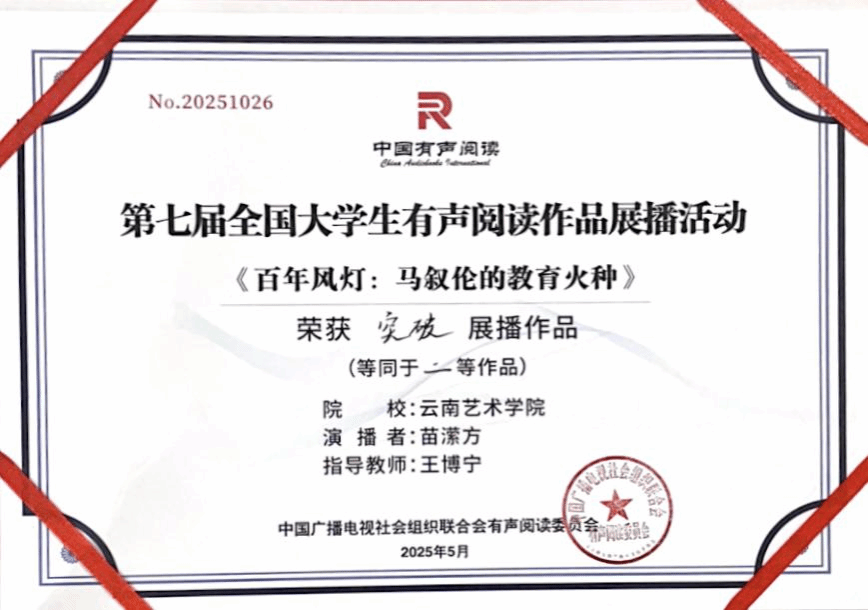 bw必威西汉姆联官方网站戏剧学院2023级播音班苗潆方同学在第七届全国大学生有声阅读作品展演活动中荣获“突破展播作品(等同于二等作品)”奖。据悉,该活动由中国广播电视社会组织联合会有声阅读委员会、浙江教育出版社集团、天津传媒学院共同主办,5月26日在天津传媒学院举办。