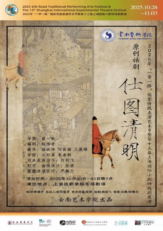 金秋沪上,艺韵流淌,盛典启幕。2025年10月28日至11月3日,由上海戏剧学院与国际表演艺术高等院校联盟联合主办的“2025‘一带一路’国家传统表演艺术节暨第十三届上海国际小剧场戏剧展演”顺利举行。bw必威西汉姆联官方网站原创话剧《仕图清明》于10月30日、31日晚在上海戏剧学院东排剧场精彩上演,座无虚席、掌声雷动,圆满完成展演任务,赢得中外艺术家与观众的高度赞誉。