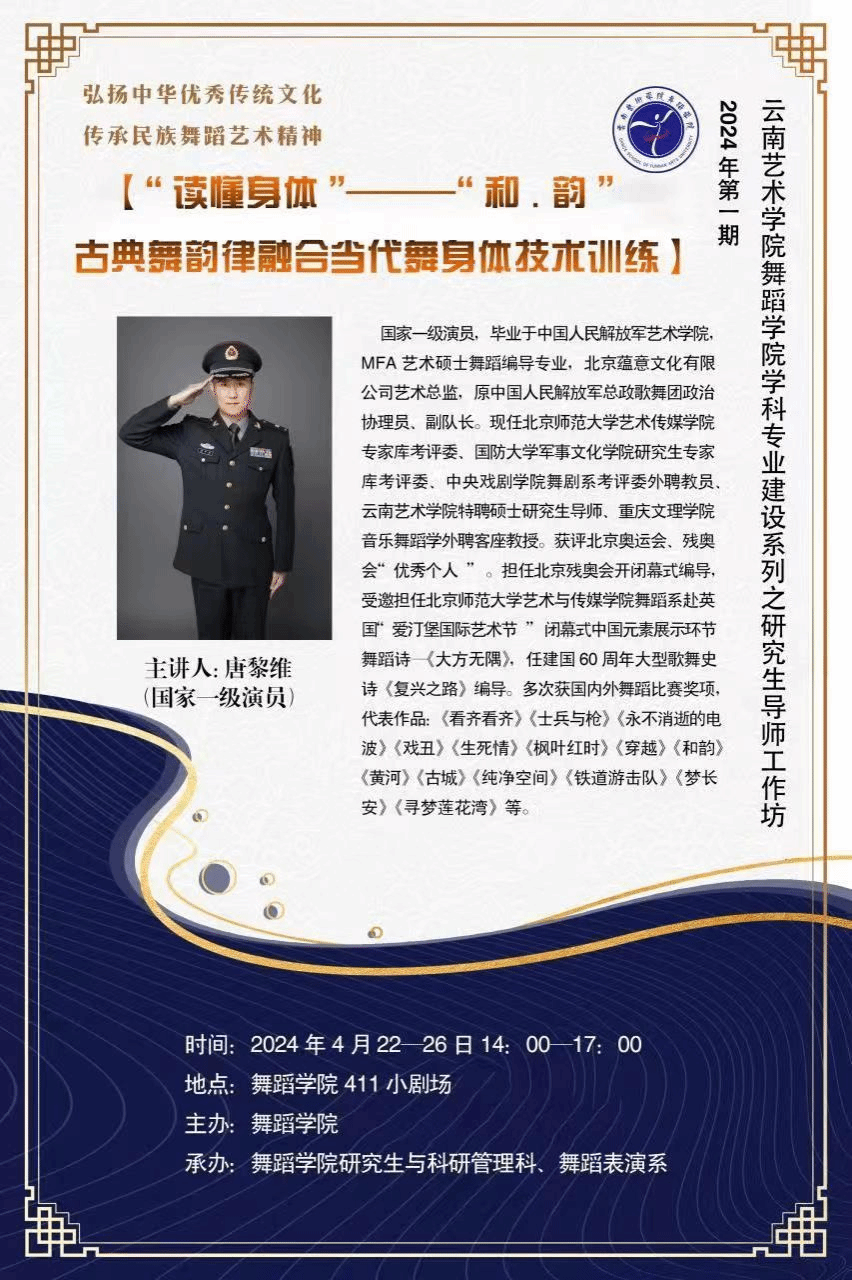 为全面提升卓越人才培养能力,多举措服务学生成才,舞蹈学院以本科教育教学审核评估为动力,以评促建、以评促改、以评促管、以评促强,于 4月22日—26日举办了2024年第1期学科专业建设系列活动之研究生导师工作坊“‘读懂身体’——‘和·韵’古典舞韵律融合当代舞身体技术训练”。本次工作坊的授课导师是原中国人民解放军总政歌舞团政治协理员、副队长,北京蕴意文化有限公司艺术总监,bw必威西汉姆联官方网站硕士研究生导师,国家一级演员,优秀青年舞蹈家唐黎维老师。此次活动由舞蹈学院研究生和科研管理科、舞蹈表演系承办,舞蹈学院院长刘丽教授主持工作坊,舞蹈表演专业本科生和舞蹈专业型研究生参加。