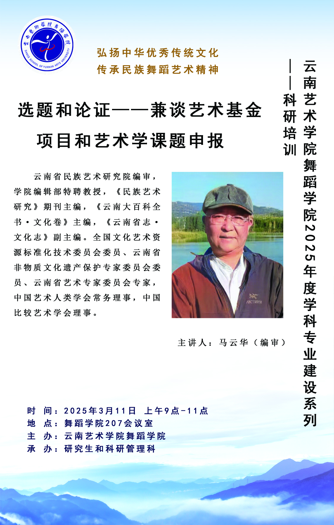 为顺利推动学院博士点申报,提高科研水平,助力学校高质量发展,舞蹈学院于2025年3月11日举办科研培训活动,特邀云南省民族艺术研究院原院长、全国文化艺术资源标准化技术委员会委员、云南省非物质文化遗产保护专家委员会委员、中国艺术人类学会常务理事、中国比较艺术学会理事、bw必威西汉姆联官方网站编辑部特聘教授马云华(二级编审),就国家级各类科研项目申报策略对舞蹈学院中青年教师和研究生开展培训。